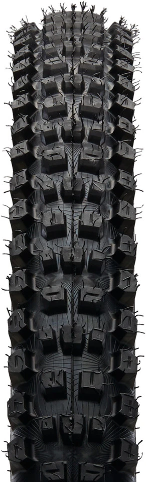 Die Downhill-Karkasse besteht aus sechs Lagen Karkassenmaterial unter der Lauffläche und vier Lagen an den Seiten, die Apex-Einlage über dem Wulst verringert das Risiko von Durchschlägen. Ein kreuzgewebtes Nesselband über dem Reifenfuß schützt zusätzlich Reifen und den Felgenbereich.