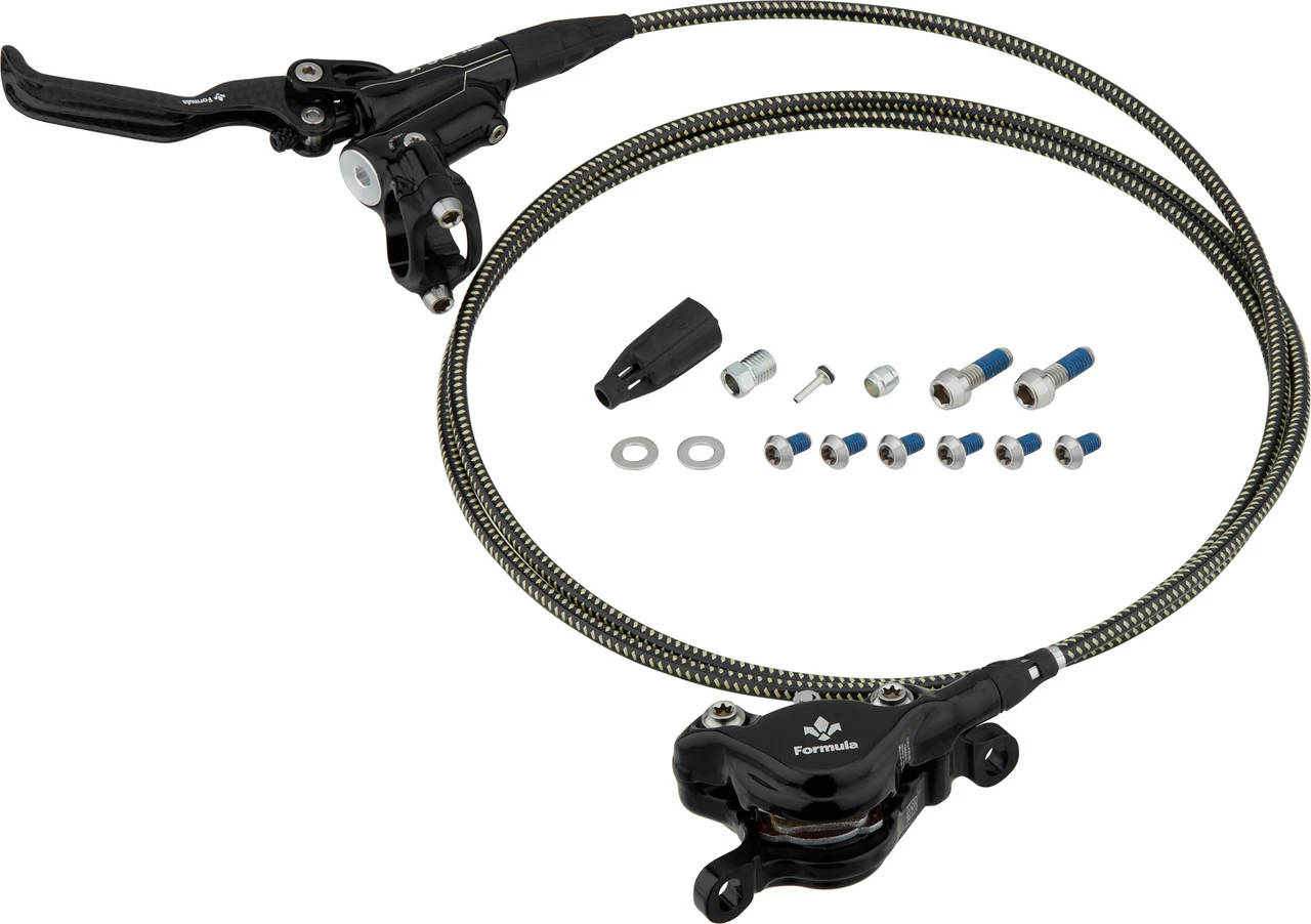 Spezifikationen:Einsatzbereich:Cross CountryBremsentyp:hydraulisch, 2-KolbenBremsmedium:MineralölLeitung:KevlarLeitungslänge VR/HR:1750 mmTechnische Daten Bremssattel:Montage Bremssattel:PostmountKolben:2Bremsbelag:organisch mit Trägerplatte aus AluminiumBauweise:2-teiligMaterial Bremssattel:AluminiumLeitungsanschluss:GeradeTechnische Daten Bremsgriff:Hebellänge:2-FingerEinstelloptionen:GriffweitenverstellungMontage:Klemmschelle (geteilt)Bauart:1-teiligMaterial Bremshebel:CarbonMaterial Bremsgriffgehäuse:AluminiumHerstellernummern:glossy black:FD94175-XUgold:FD94175-XPpolish:FD94175-XGLieferumfang:1 x Bremssattel Formula CURA X1 x Bremsgriff Formula CURA X1 x Bremsleitung Formula
