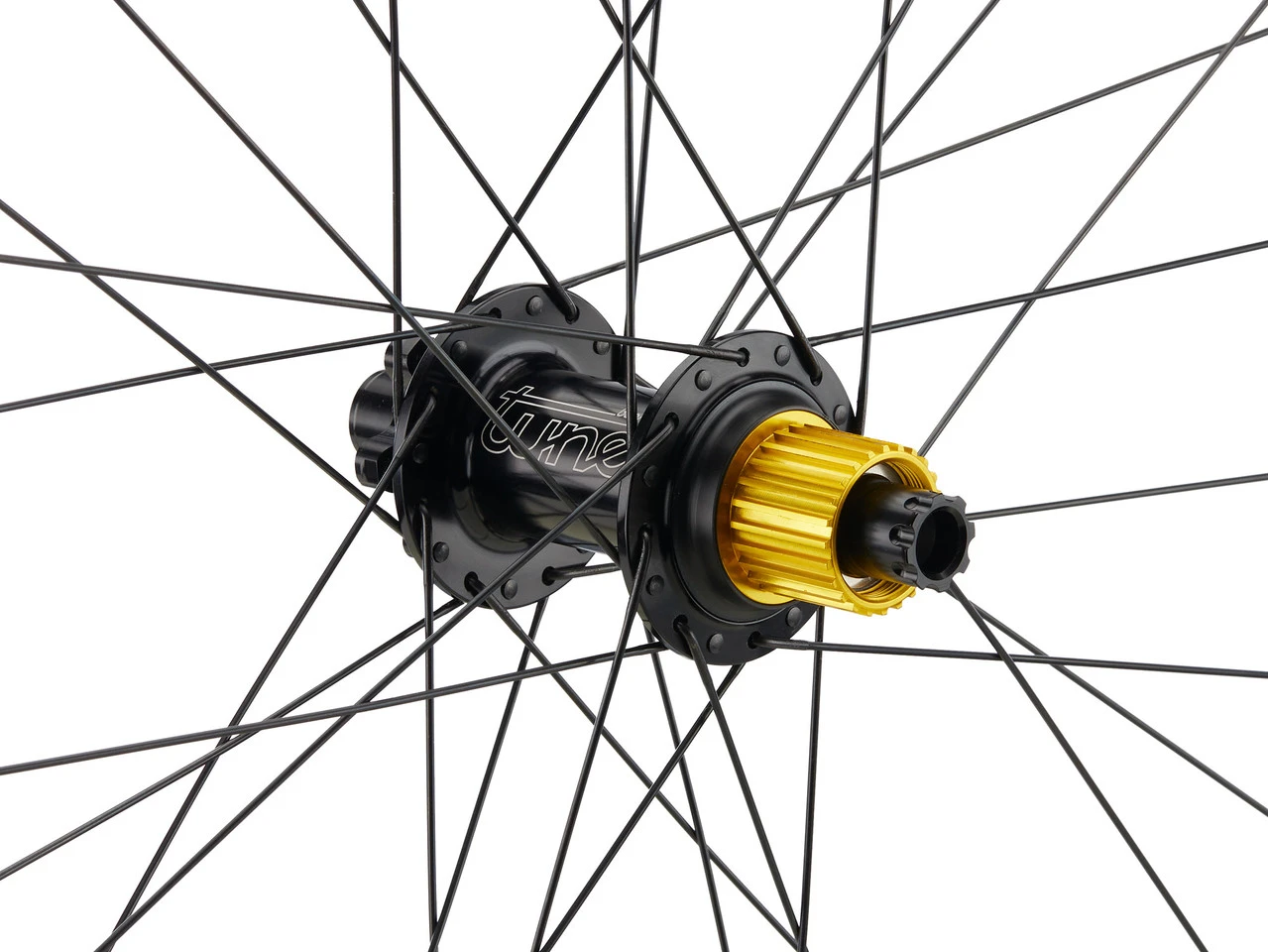Spezifikationen:Einsatzbereich:Cross CountryLaufradgröße:29″Reifentyp:Draht-/FaltreifenAnzahl Speichen:32Bremssystem:Disc 6-LochLaufradstandard:BoostTubeless-System:Tubeless ReadyTechnische Daten Felge:Typ:NoTubes Flow MK4Felgenhorn:mit HakenDimension (ETRTO):30-622Felgenbreite innen:30 mmFelgenbreite außen:33,6 mmFelgenhöhe:18,9 mmVentilloch (-durchmesser):SV (6,5 mm)Material Felge:AluminiumTechnische Daten VR-Nabe:Typ:tune KillHillEinbaubreite:15 x 110 mm SteckachseLagerung:Endurance-Kugellager, doppelt gedichtetMaterial Nabenkörper:AluminiumTechnische Daten HR-Nabe:Typ:tune ClimbHillEinbaubreite:12 x 148 mm SteckachseLagerung:Endurance-Kugellager, doppelt gedichtetMaterial Nabenkörper:AluminiumMaterial Freilaufkörper:AluminiumFreilaufsystem:3T Endur mit 3 Titan-Sperrklinken und verstärktem FreilaufkörperTechnische Daten Einspeichung:Einspeichmuster VR:3-fach gekreuztEinspeichmuster HR:3-fach gekreuztSpeichentyp/Bauart:SAPIM D-Light / J-Bend / gerade / konifiziertMaterial Speichen:StahlNippeltyp/Bauart:Sapim Polyax Secure LockMaterial Nippel:AluminiumFreigaben:Gewichtsbeschränkung:115 kg Systemgewicht, 100 kg FahrergewichtLuftdruck max.:2,7 bar (2,3″ ), 2,3 bar (2,6″ )Empfohlene Reifenbreite:2,3″ – 2,6″Features:stabiler 29″ -MTB-Boost-Laufradsatz für 6-Loch-Bremsscheiben30 mm breite Aluminium-Felgen von Stan’s NoTubesKillHill-/ClimbHill-Naben-Kombination mit extradichter und Dreck-beständiger Endurance-Lagerungverstärkter Endurance-Freilauf für mehr Steifigkeit mit Sperrklinken aus Titanempfohlene Felgenband-Breite: 30 mmempfohlene Ventilhöhe: 35 mmHinweis des Herstellers:Dieser Laufradsatz ist nur für Tubeless-Reifen geeignet.